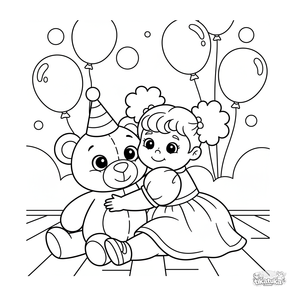 Einfaches Ausmalbild für Kleinkinder 2-3 Jahre: Ein Mädchen umarmt einen riesigen Stoffbären im Partyraum. Große Formen, breite Ränder.