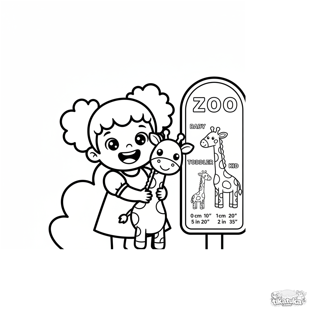 Einfaches Ausmalbild für Kleinkinder 2-3: Ein Mädchen umarmt ein Giraffen-Spielzeug an einem Höhenmesser-Schild im Zoo.