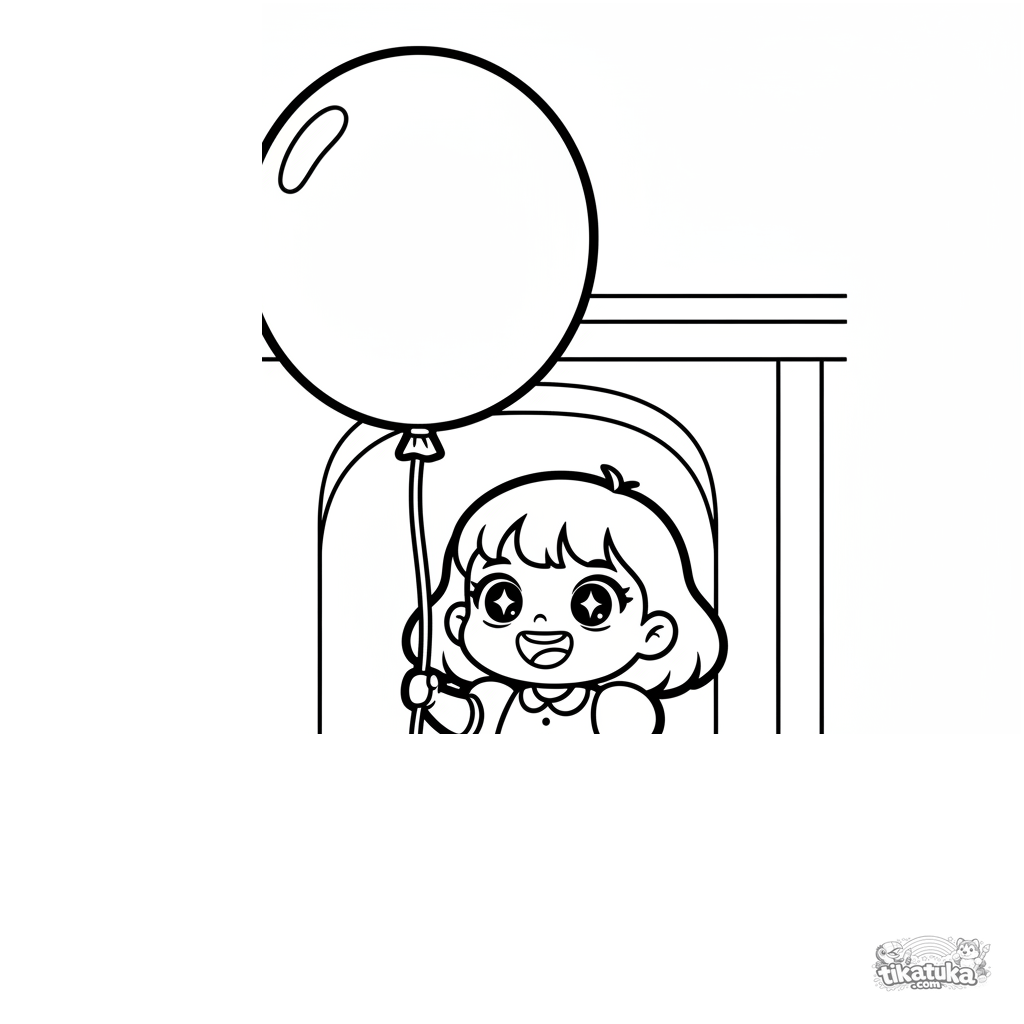 Einfaches Ausmalbild für Kleinkinder 2-3: Ein kleines Mädchen mit einem riesigen Luftballon in einer Festhalle. Große klare Formen, wenige Details.