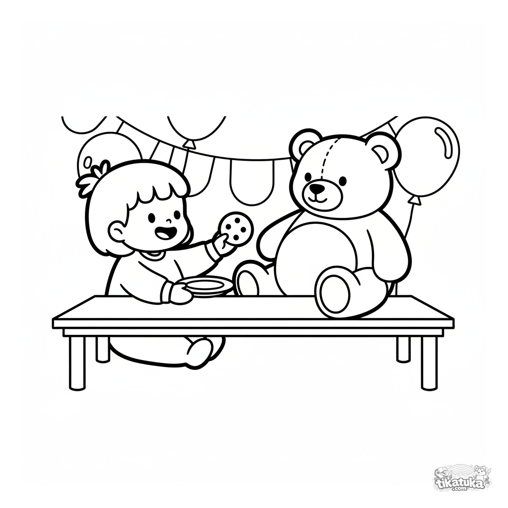 Ausmalbild für Kleinkinder 2-3 Jahre: Ein Mädchen teilt mit ihrem Teddybär an einem Festtisch. Sehr einfache Umrisse.