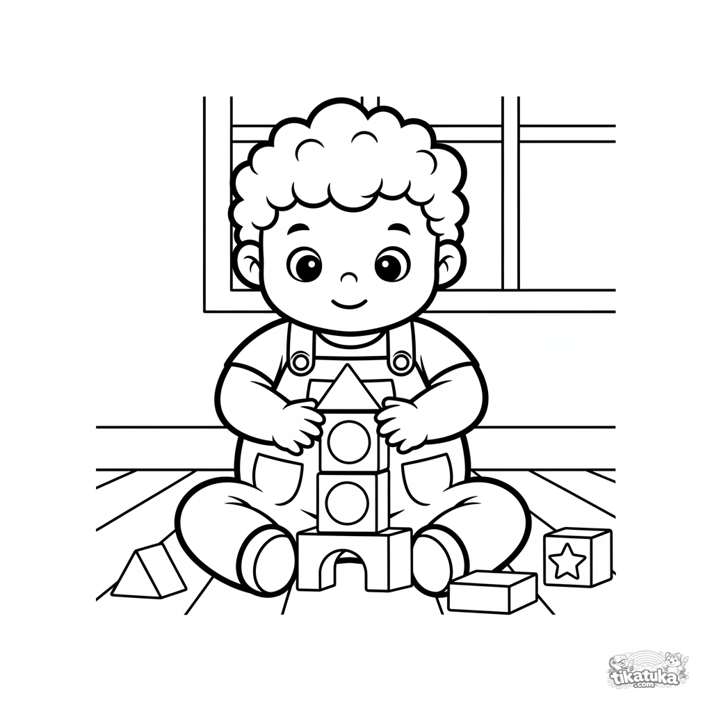 Sehr einfaches Ausmalbild für Kleinkinder 2-3: Ein Kind baut einen Blockturm im Klassenzimmer. Große, klare Formen, perfekt für erste Buntstifte.