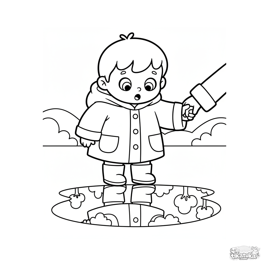 Ausmalbild für Kleinkinder (2-3 Jahre): ein Kind in Regenjacke hält die Hand eines Elternteils und schaut staunend auf die Himmelsreflexion in einer Herbstpfütze. Sehr einfache, große Formen.