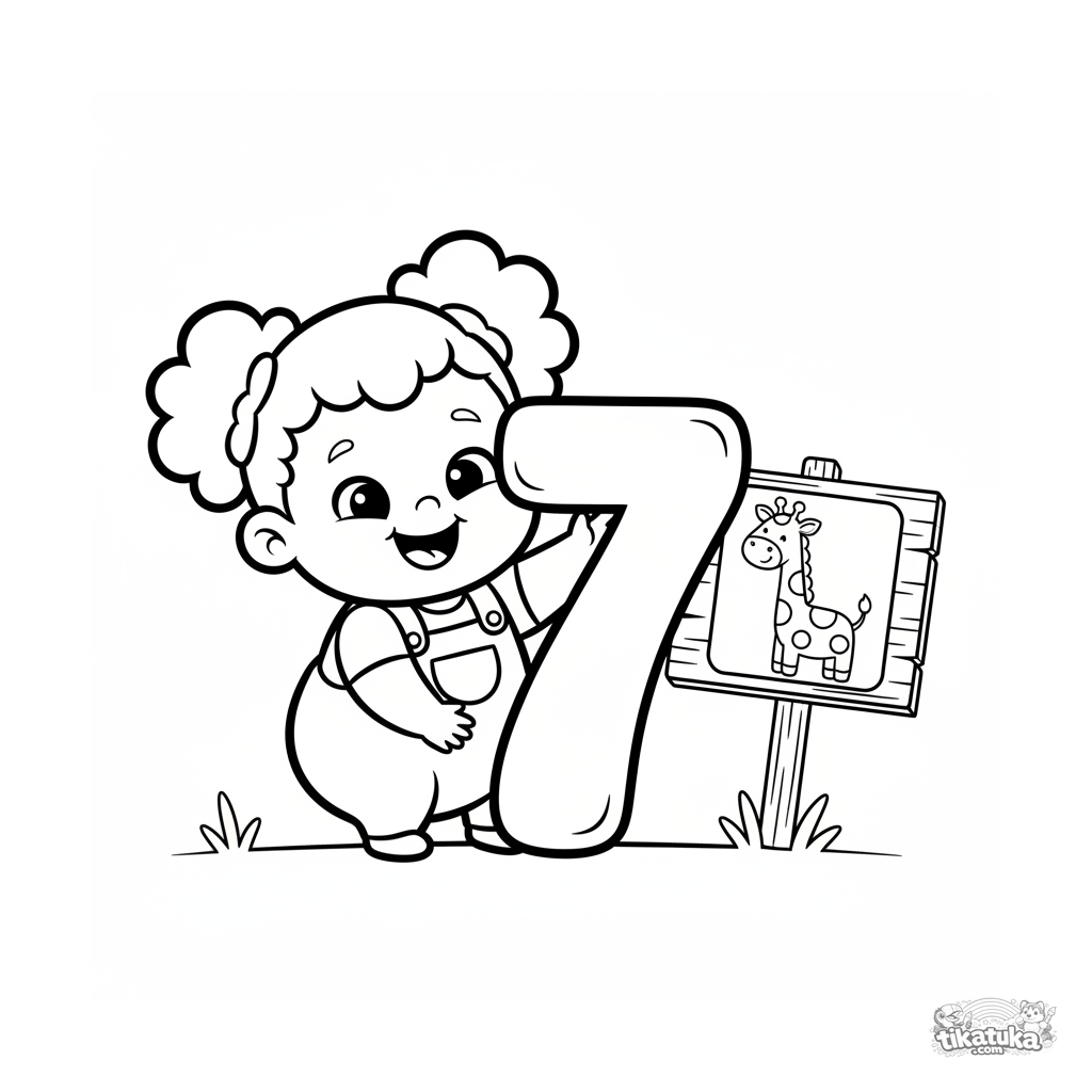 Einfaches Ausmalbild für Kleinkinder 2-3 Jahre. Ein kicherndes Kleinkind umarmt eine riesige, freundliche Zahl 7 auf einem Schild, das Giraffenflecken zählt.