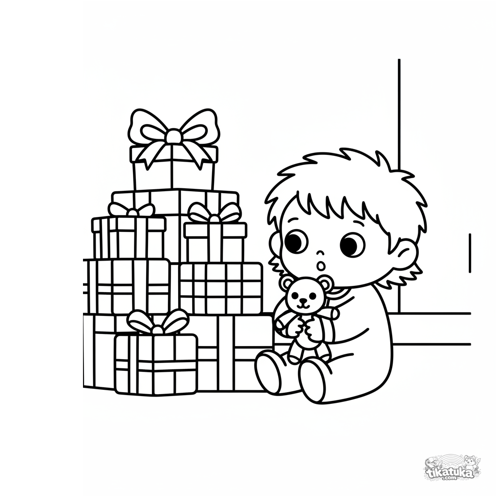 Sehr einfaches Ausmalbild für Kleinkinder 2-3: Ein Mädchen im Schlafanzug sitzt neben einem Geschenkeberg in einem Festsaal. Große Formen.