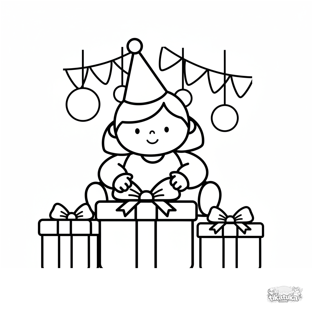 Sehr einfaches Ausmalbild für Kleinkinder 2-3: Ein Kind mit Partyhut sitzt zwischen großen Geschenkboxen.