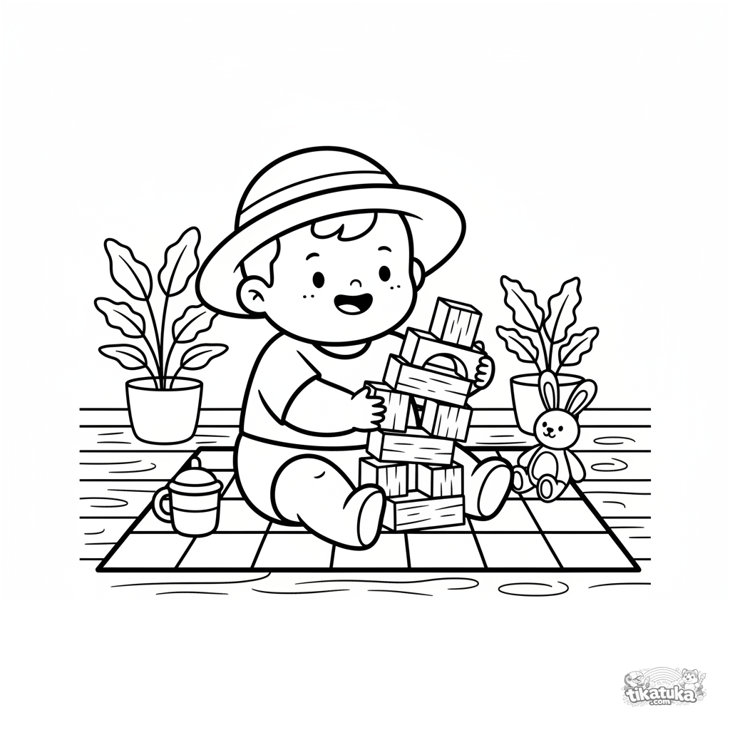 Sehr einfaches Ausmalbild für Kleinkinder 2-3: Kind baut einen Blockturm auf der Veranda. Große, klare Formen.