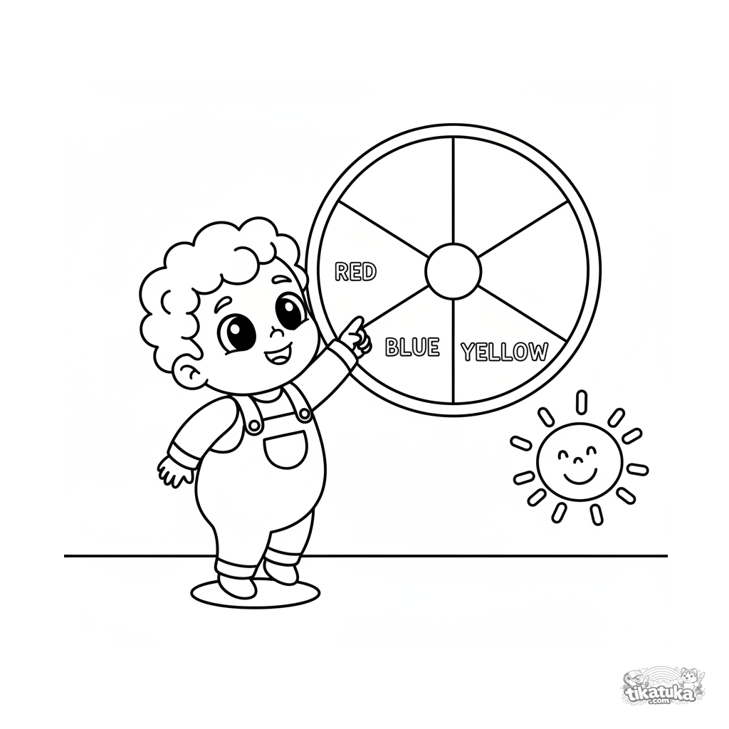 Sehr einfaches Ausmalbild für Kleinkinder 2-3: ein Kind an einem großen Farbrad an der Wand im Kleinkindbereich des Zoos. Große, klare Formen.