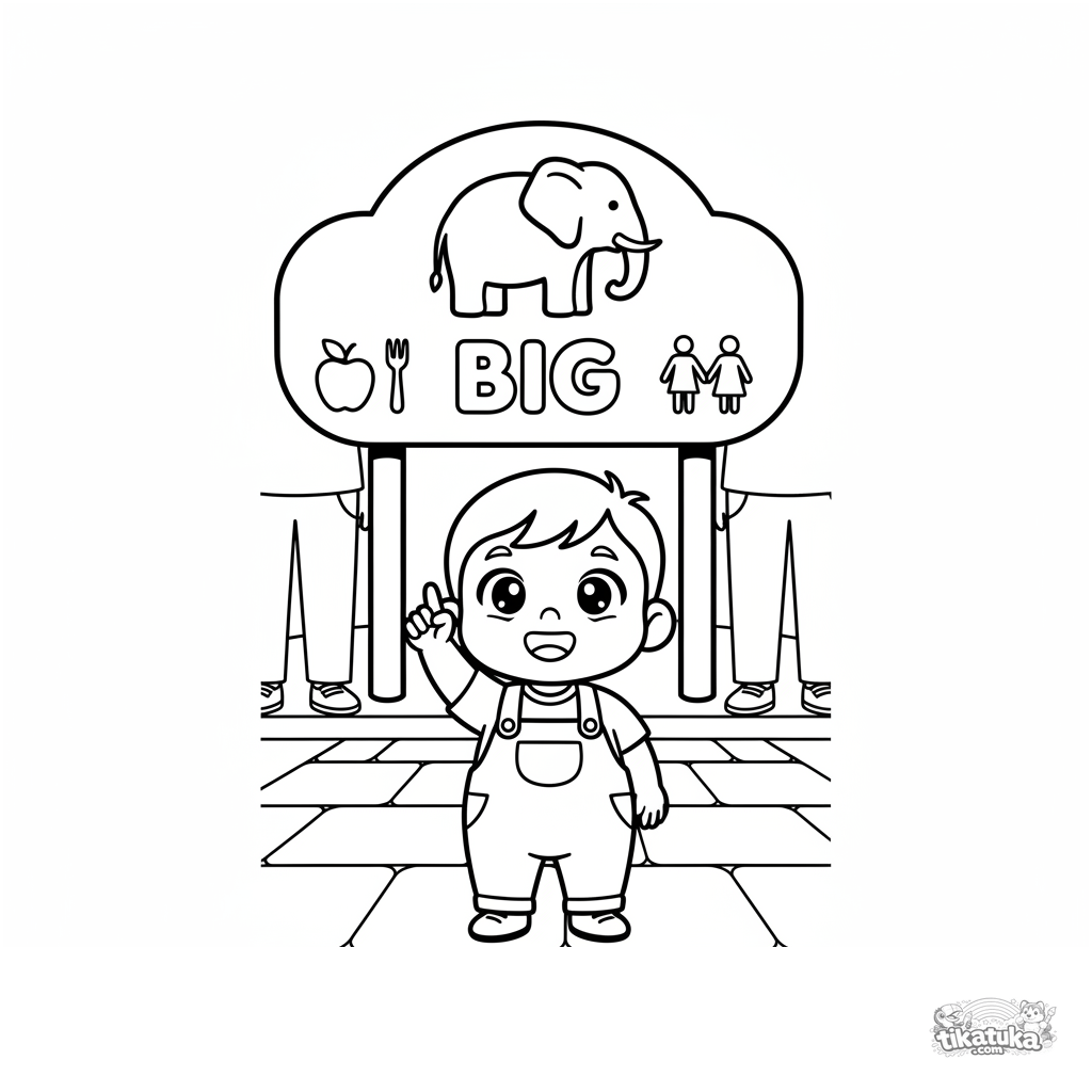Einfaches Ausmalbild für Kleinkinder 2-3: Ein Kind zeigt auf ein großes Schild mit einem Elefanten und dem Wort 'GROSS' im Zoo. Große Formen, weite Ränder.