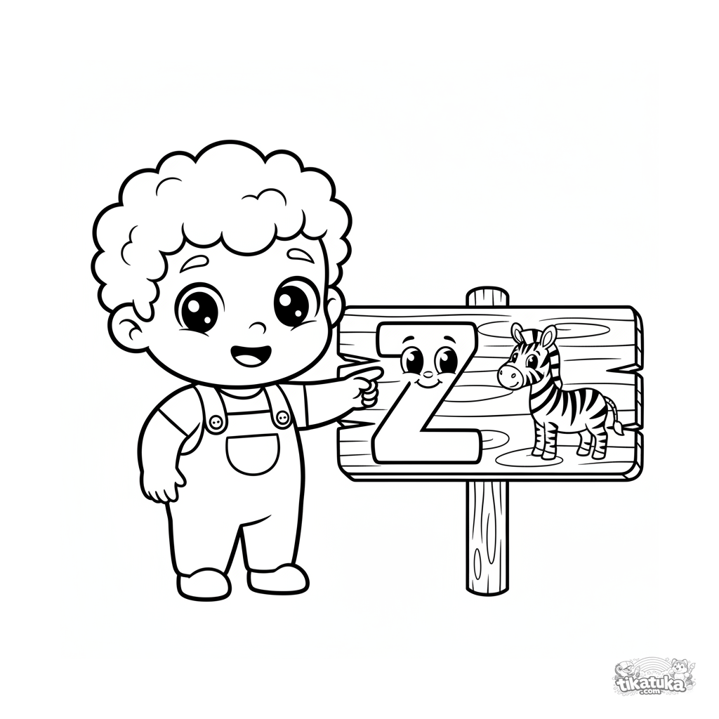 Ausmalbild für Kleinkinder von 2-3 Jahren. Ein glückliches Kleinkind zeigt auf einen großen Buchstaben Z neben einem Zebra-Bild auf einem Zoo-Schild. Riesige einfache Formen für erste Ausmalversuche.