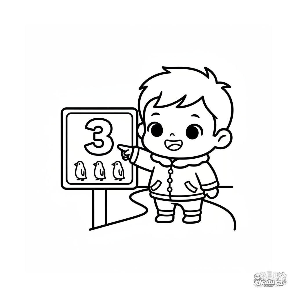 Einfaches Ausmalbild für Kleinkinder 2-3: Ein Kind an einer Zootafel zeigt auf die große Zahl 3 und drei Pinguine. Große Formen und weite Ränder für erste Malerfahrung.