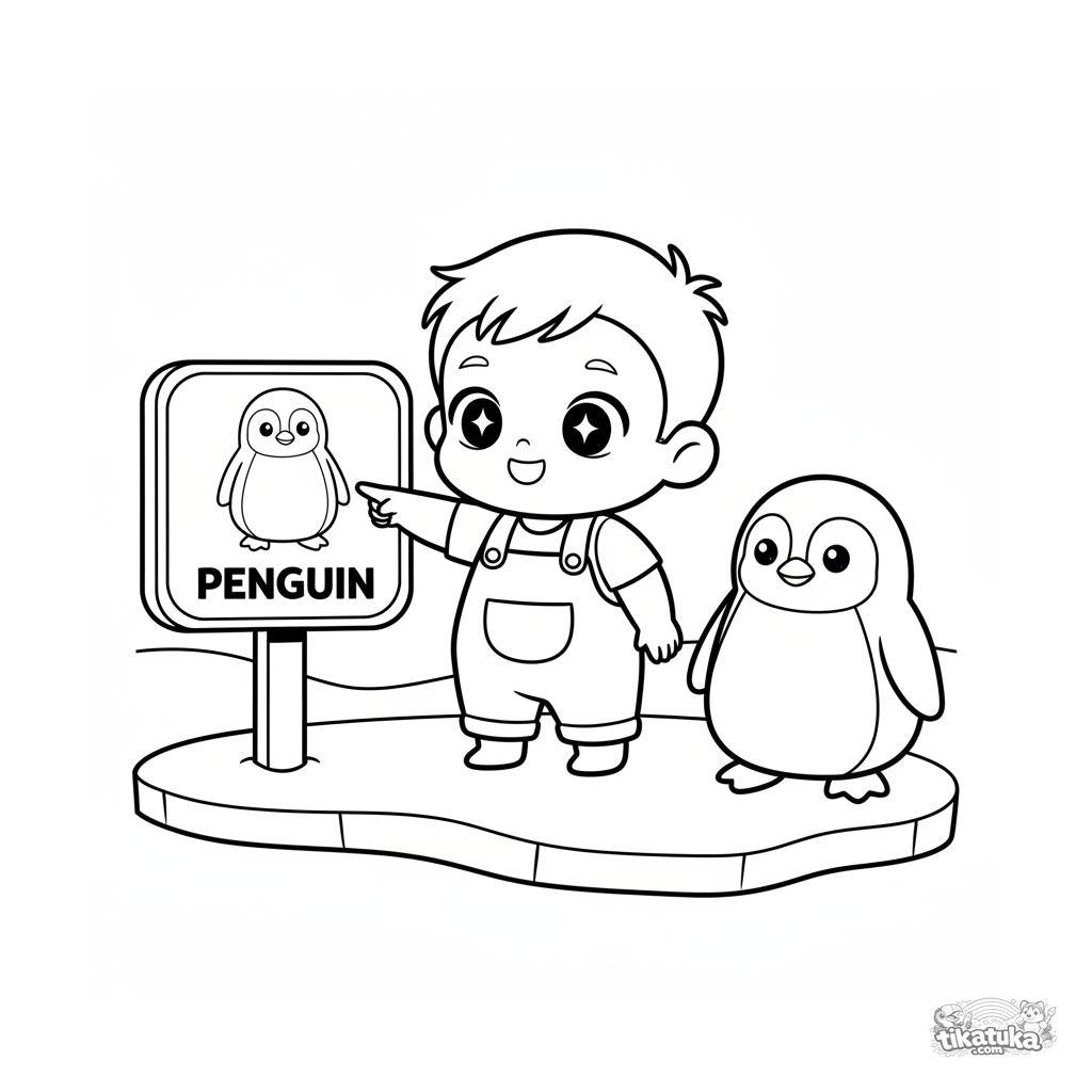 Einfaches Ausmalbild für Kleinkinder 2-3: Ein Kind zeigt auf ein großes Pinguin-Infoschild im Zoo. Große Formen und weite Ränder für erste Malerfahrung.