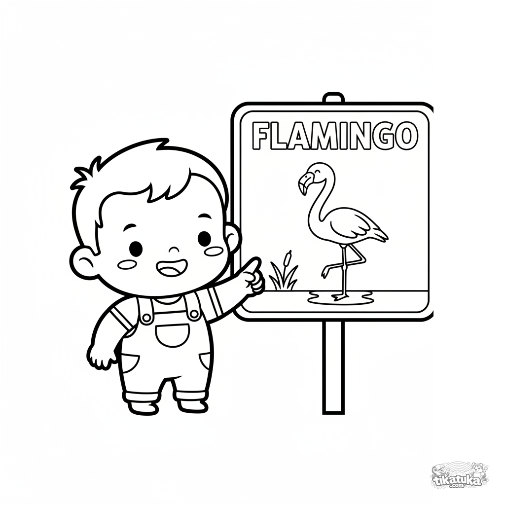 Einfaches Ausmalbild für Kleinkinder 2-3: Ein Kind zeigt auf ein großes Flamingo-Schild im Zoo. Große Formen, breite Ränder für erste Malerfahrung.