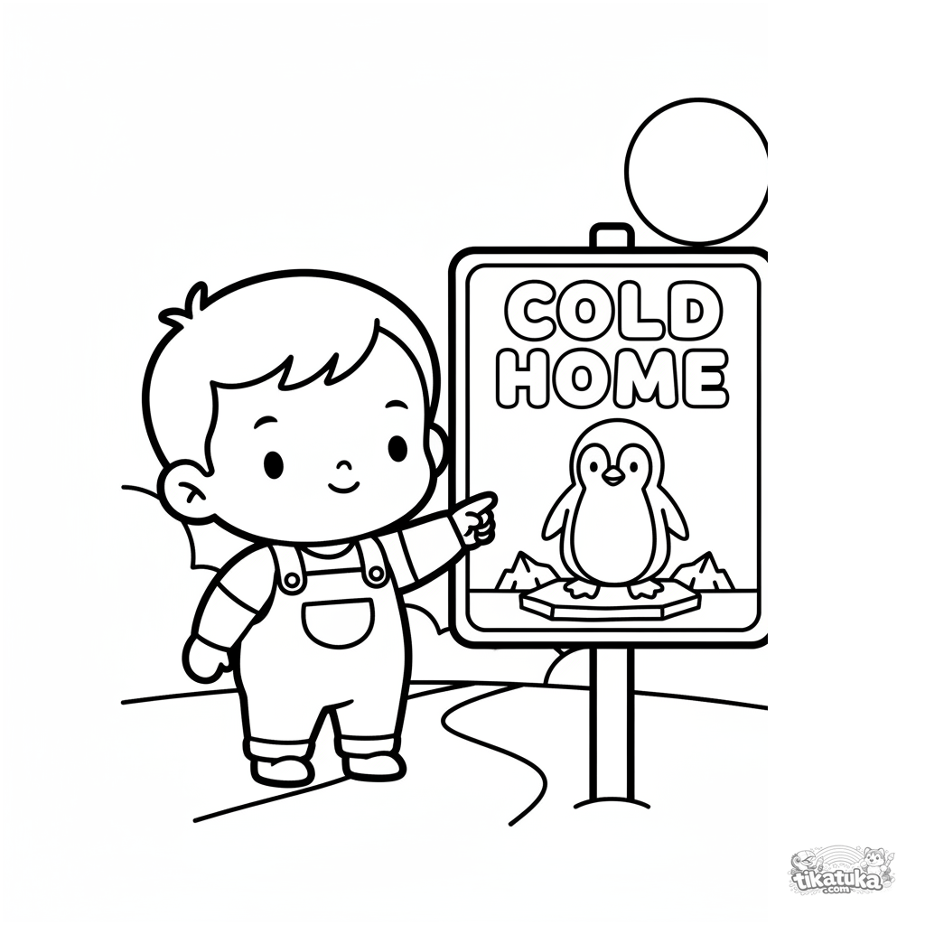Einfaches Ausmalbild für Kleinkinder 2-3: Ein Kind zeigt auf ein großes Pinguin-Lebensraum-Schild. Sehr große Ränder, einfache Formen.