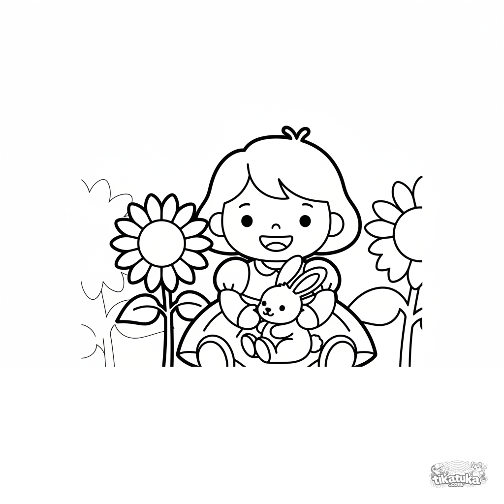 Einfaches Ausmalbild für Kleinkinder 2-3: Eine kleine Prinzessin sitzt in einem Sonnenblumenfeld und streichelt ein flauschiges Häschen. Große Formen, weite Ränder.