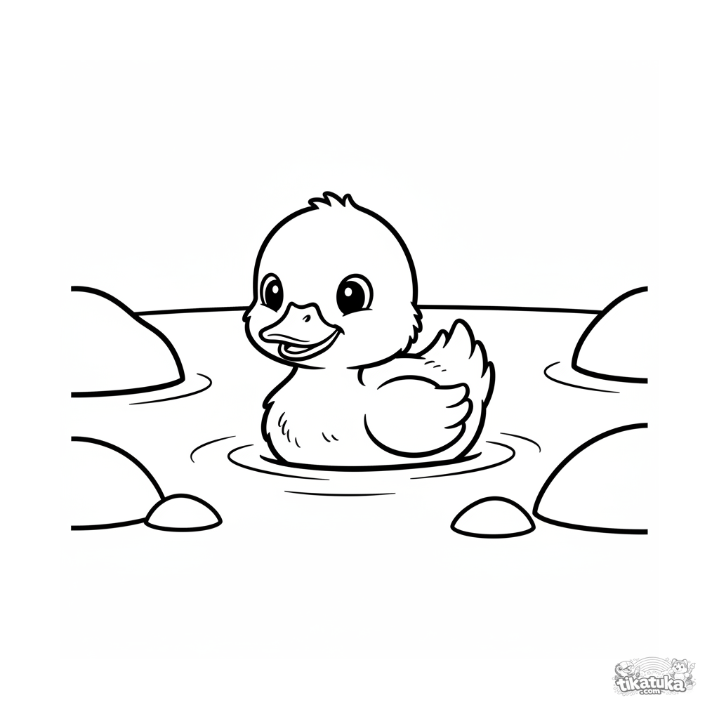 Sehr einfaches Ausmalbild für Kleinkinder 2-3: Ein flauschiges Entenküken schwimmt auf einem ruhigen Bach. Große, klare Formen, minimale Details.