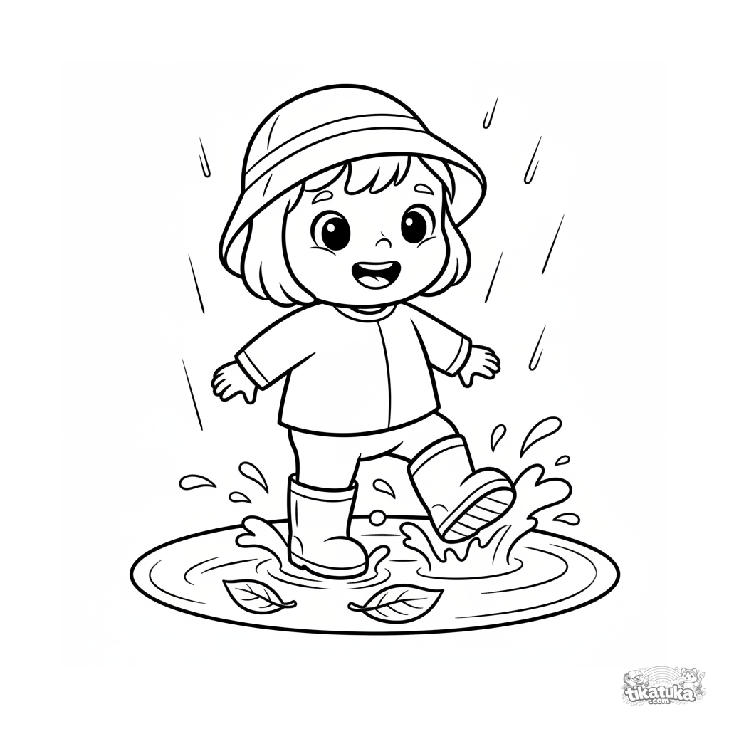 Sehr einfaches Ausmalbild für Kleinkinder 2-3: Ein fröhliches Kleinkind in großen Stiefeln plantscht in einer Herbstpfütze im Regen.