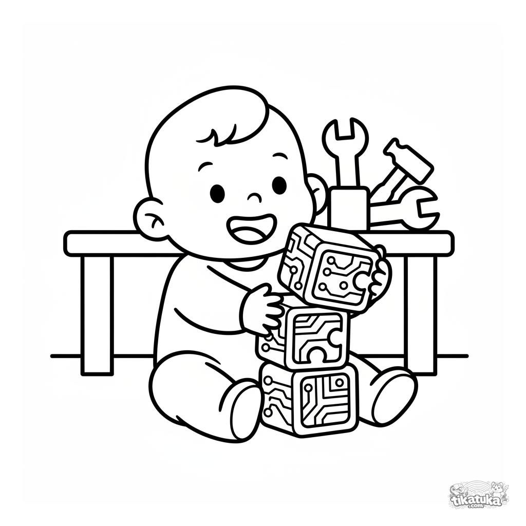 Sehr einfaches Ausmalbild für Kleinkinder 2-3: ein fröhliches Kleinkind baut einen Turm mit großen Schaltkreis-Blöcken in einem Labor.