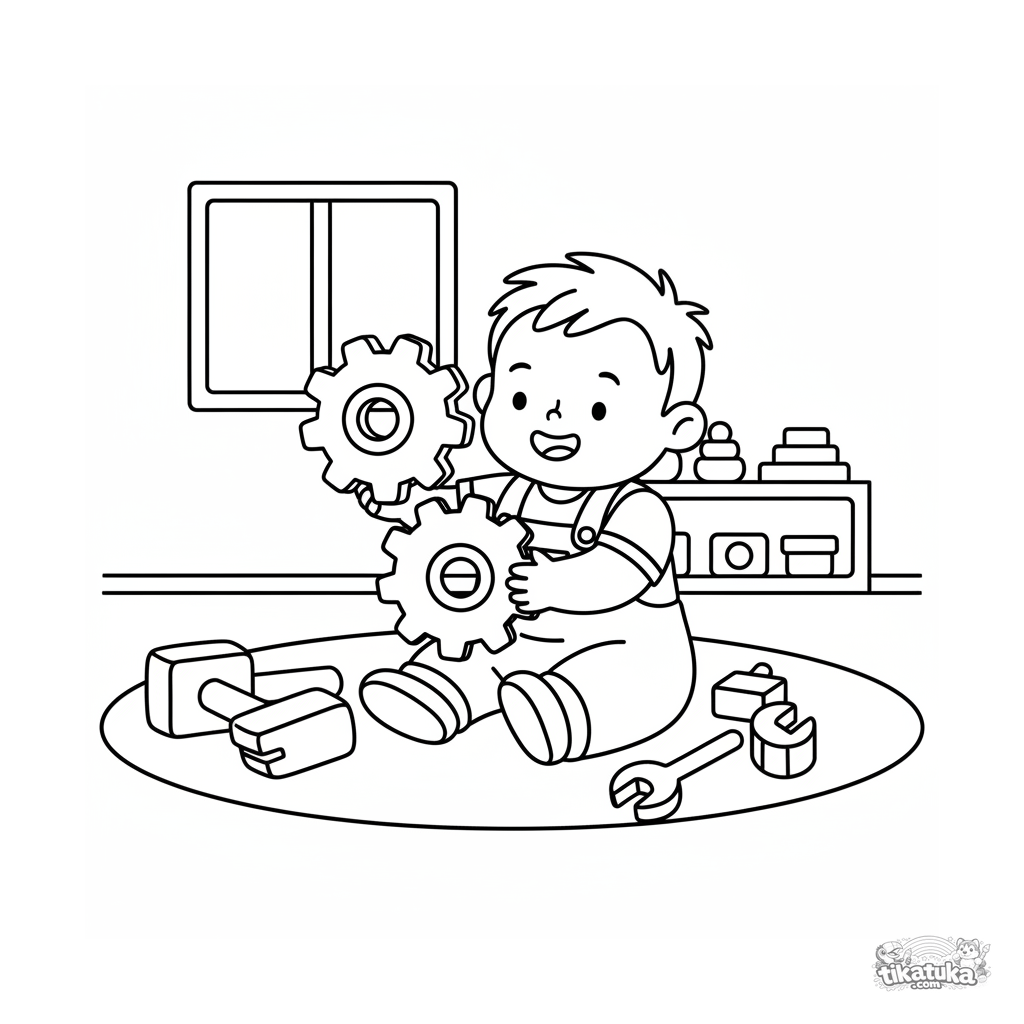 Sehr einfaches Ausmalbild für Kleinkinder: Ein Kind stapelt riesige Zahnräder im Spielbereich des Labors.