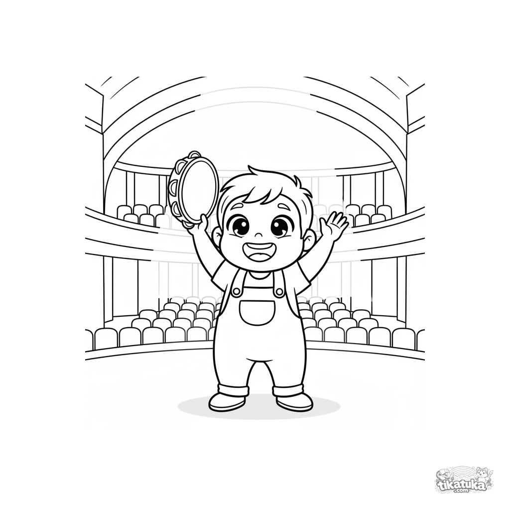 Einfaches Ausmalbild für Kleinkinder 2-3: Ein fröhliches Kleinkind mit einem Tamburin auf der Bühne. Große Formen und weite Ränder.