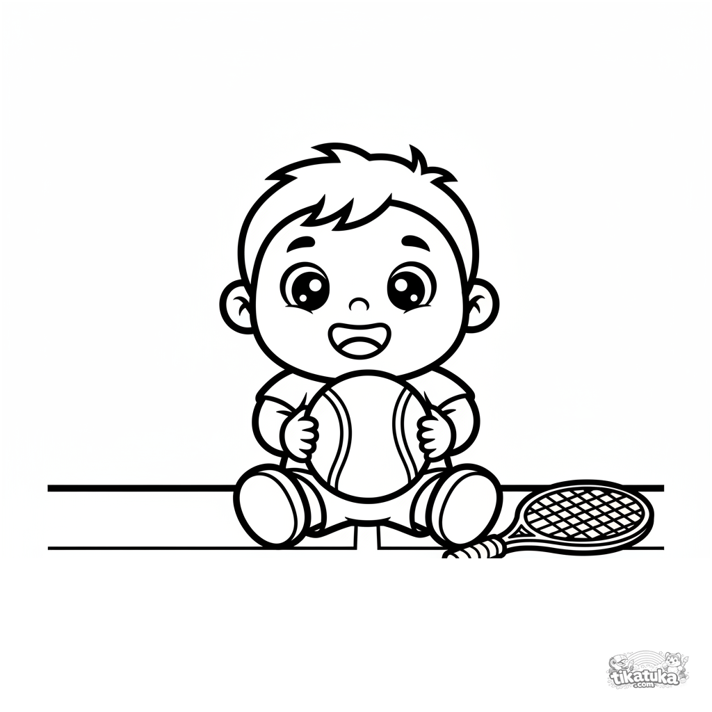 Ausmalbild für Kleinkinder 2-3 Jahre: ein Kind sitzt auf einem Tennisplatz mit einem großen Ball. Einfache Formen, breite Ränder.