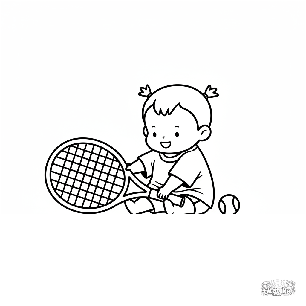 Ausmalbild für Kleinkinder 2-3 Jahre: ein lustiges Kleinkind auf einem Tennisplatz erkundet einen großen Schläger. Riesige einfache Formen, minimale Details, breite Ränder.