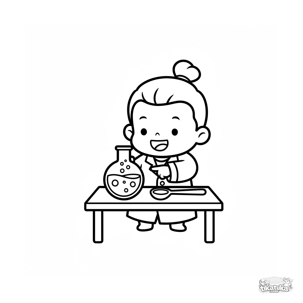 Ausmalbild für Kleinkinder 2-3: Ein kleiner Forscher in einem Labor beobachtet einen magischen brodelnden Trank mit Begeisterung. Sehr einfache und große Formen zum Ausmalen.