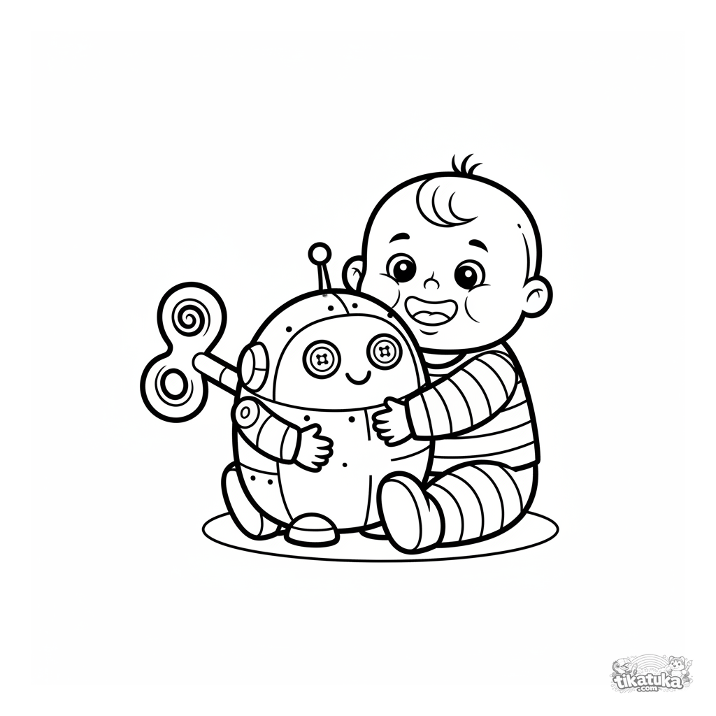 Sehr einfaches Ausmalbild für Kleinkinder 2-3: Ein Junge im Schlafanzug sitzt und umarmt ein großes Roboterspielzeug mit einem riesigen Aufziehschlüssel.