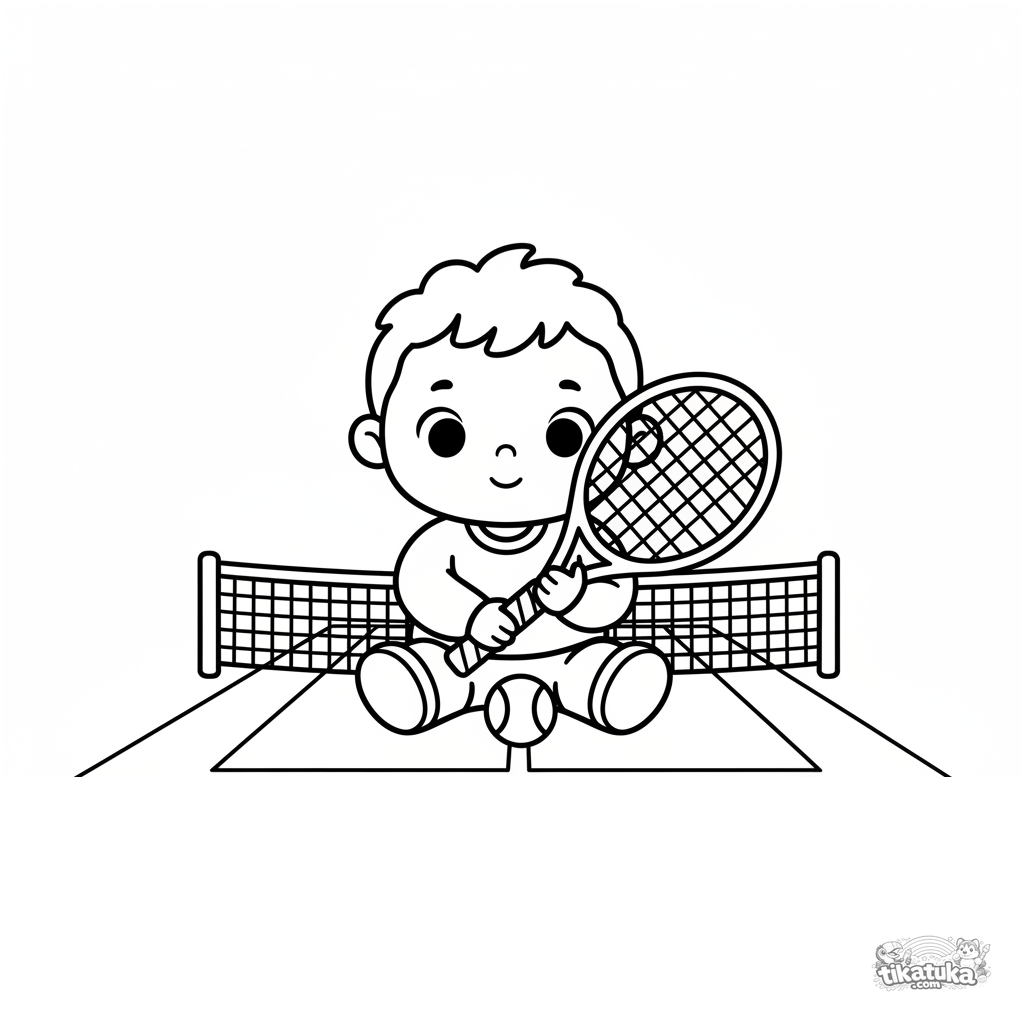 Ganz einfaches Ausmalbild für Kleinkinder 2-3 Jahre: Ein Kind sitzt auf dem Platz mit einem großen Schläger. Große Formen, dicke Umrisse.
