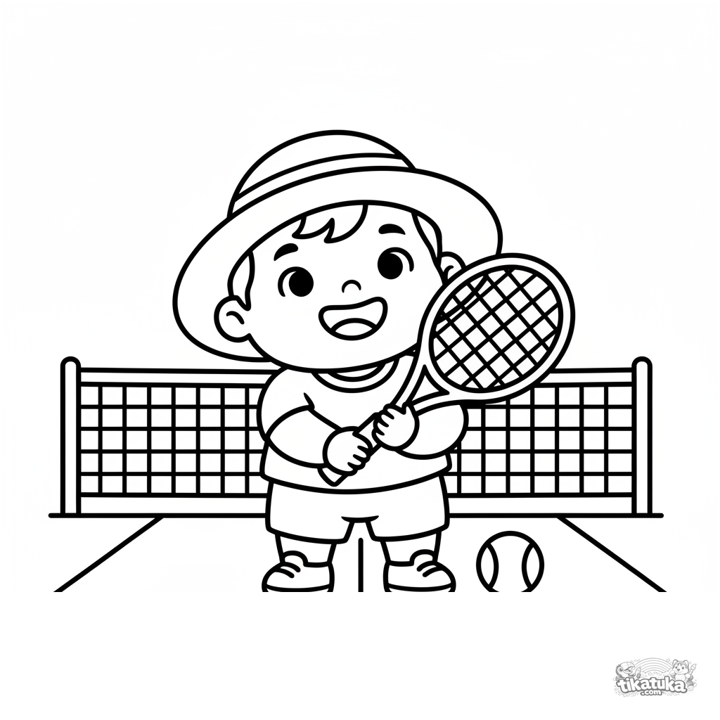 Kleinkind Ausmalbild 2-3 Jahre: Ein glückliches Kleinkind mit Hut steht auf einem Tennisplatz mit großem Schläger. Einfache Formen, große Details, breite Ränder.