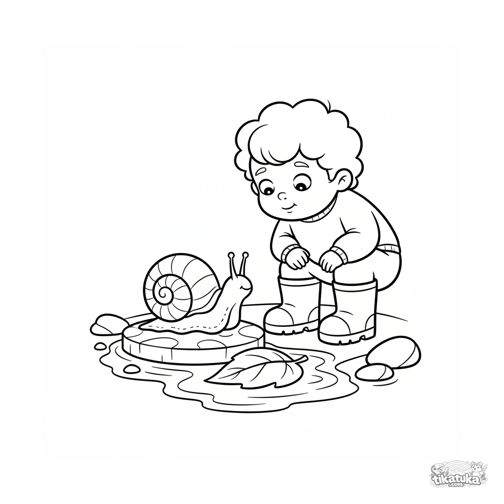 Ausmalbild für Kleinkinder 2-3 Jahre: ein Kind in Stiefeln beobachtet neugierig eine Schnecke in einer Herbstpfütze. Große weiche Formen, wenige Details.
