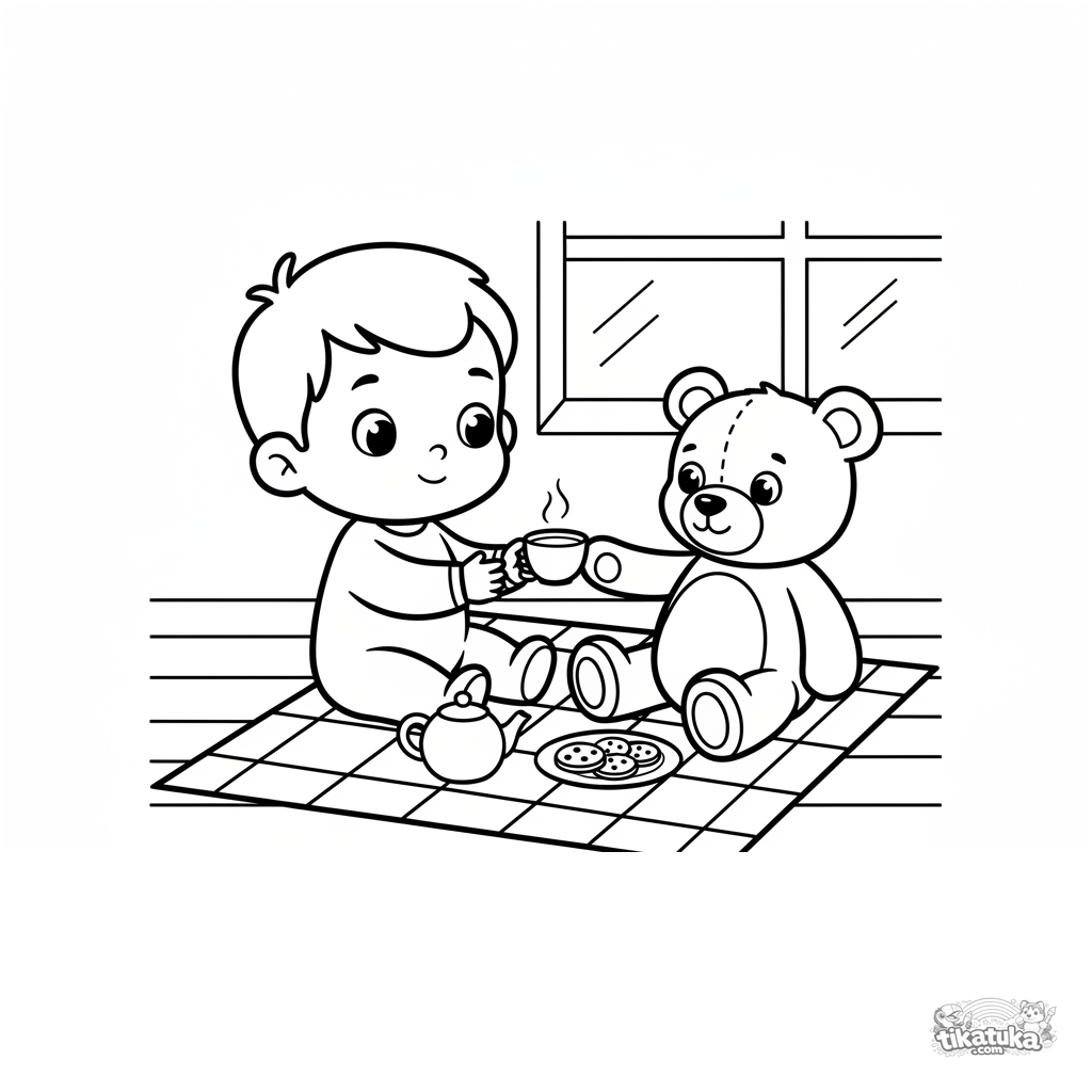 Einfaches Ausmalbild für Kleinkinder 2-3: Ein Kind hat eine Tee-Party mit einem Teddybär auf einer Decke auf der Veranda. Große Formen, wenige Details.