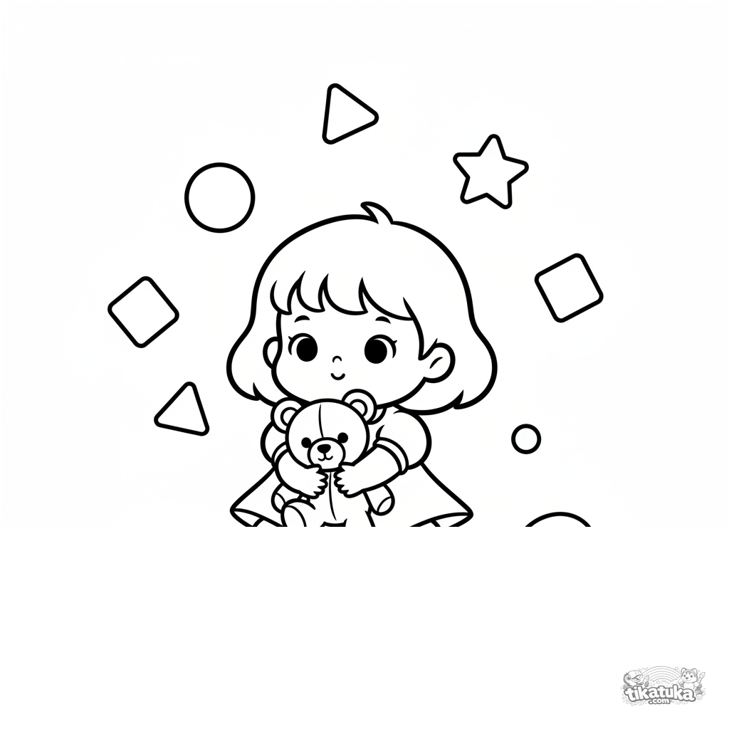 Einfaches Ausmalbild für Kleinkinder 2-3: Ein kleines Mädchen mit Teddybär sitzt in einem festlichen Saal und beobachtet fallendes Konfetti. Große Formen, breite Ränder.