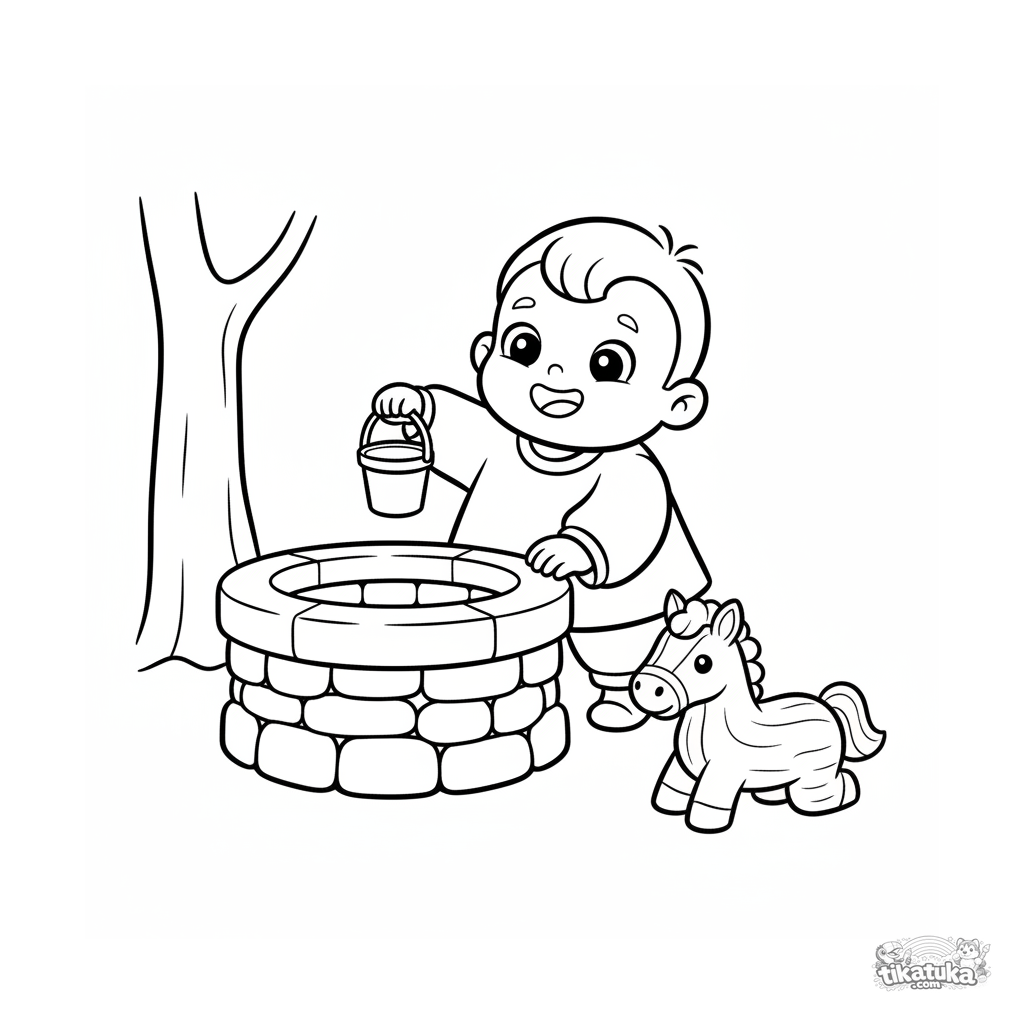 Ganz einfaches Ausmalbild für Kleinkinder 2-3: Ein Kind mit Spielzeugeimer am Brunnen. Große Formen, dicke Umrisse, viel Freiraum.