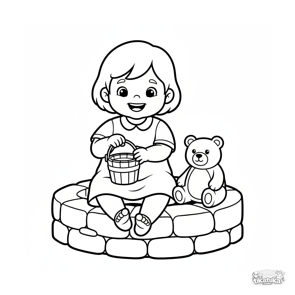 Sehr einfaches Ausmalbild für Kleinkinder 2-3: Ein Kind sitzt am Brunnen mit einem Spielzeugeimer. Große Formen, wenige Details, breite Ränder zum Ausmalen.