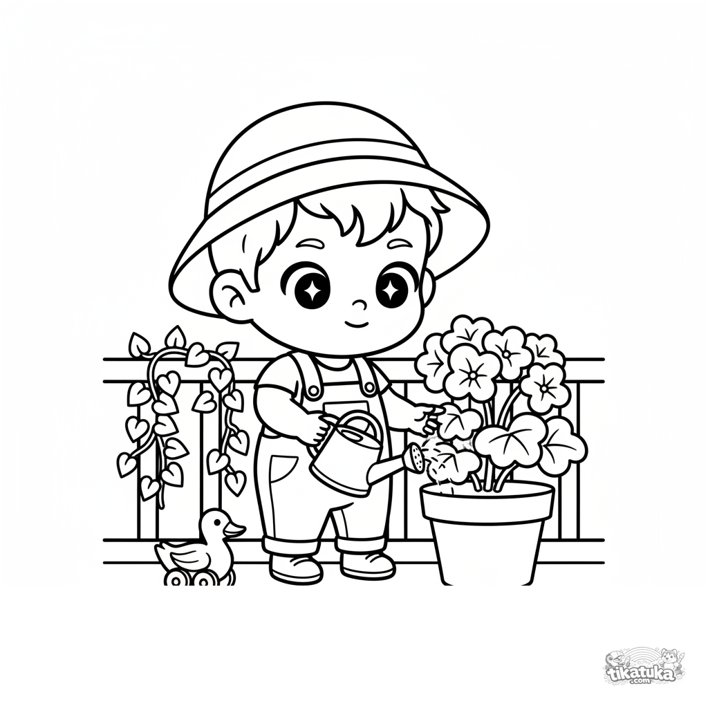 Einfaches Ausmalbild für Kleinkinder 2-3: Ein Kind gießt Blumen auf einer Datscha-Veranda. Große Formen, klare Umrisse, viel Freiraum zum Ausmalen.