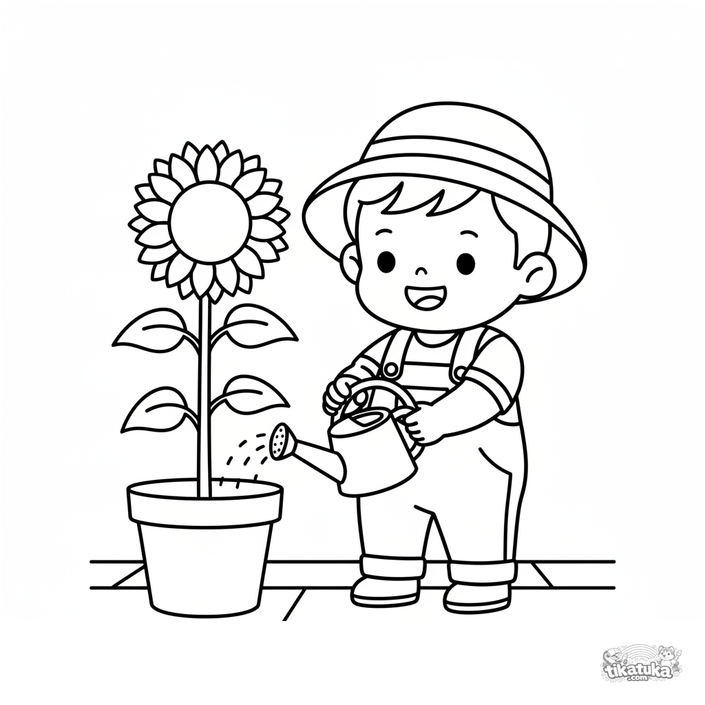 Einfaches Ausmalbild für Kleinkinder 2-3: Ein Kind gießt eine große Blume auf der Veranda. Große klare Formen, breite Ränder.