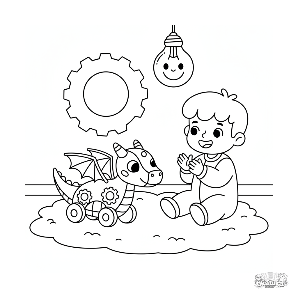 Sehr einfaches Ausmalbild für Kleinkinder 2-3: Ein Junge in einem geheimen Labor freut sich über einen Aufzieh-Spielzeugdrachen, mit großen Formen zum Ausmalen.