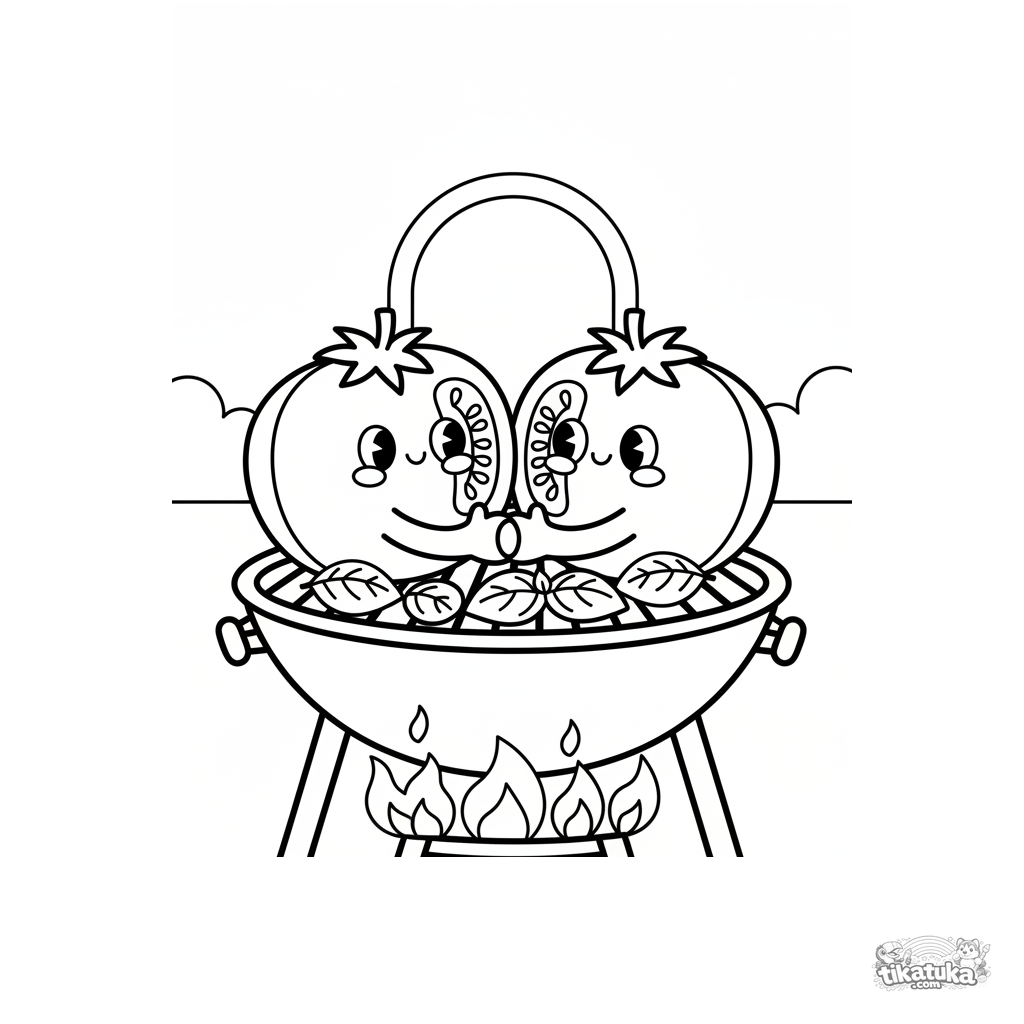 Sehr einfaches Ausmalbild für Kleinkinder 2-3: zwei Tomatenhälften halten Händchen auf Gartengrill. Große freundliche Gesichter, wenige Details, große weiße Ränder.
