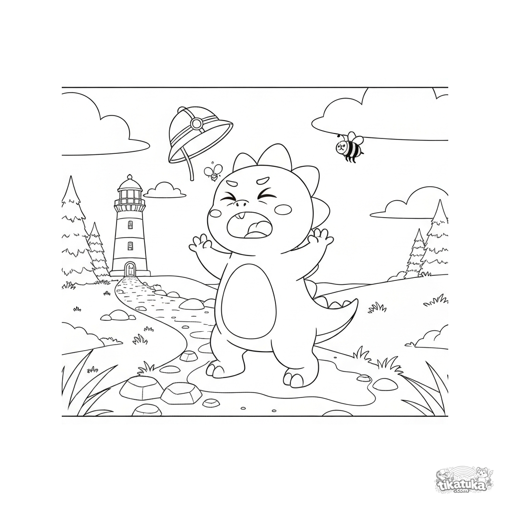 Erlebe Dino Tosha beim Niesen am Leuchtturm! Sein Helm fliegt, die Biene entkommt. Jetzt herunterladen, ausdrucken oder online ausmalen.