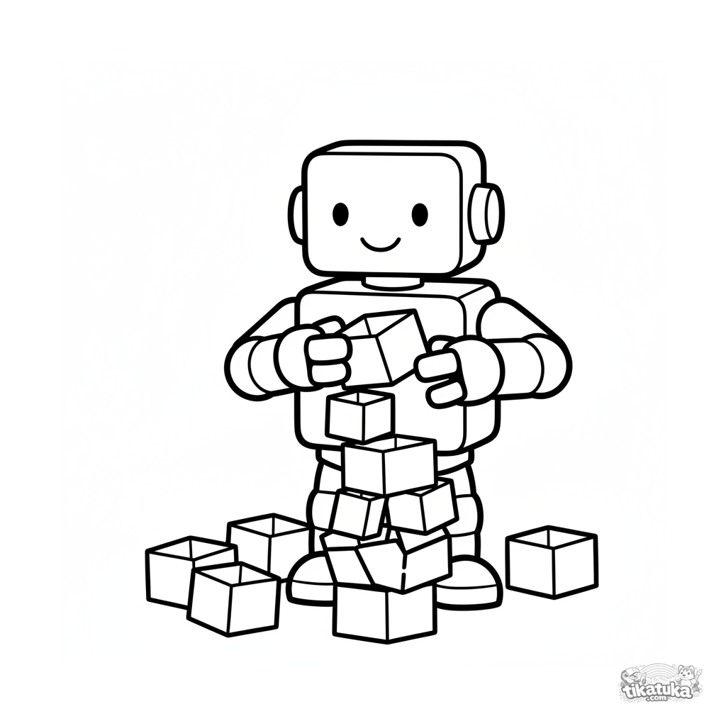 Einfaches Ausmalbild für Kleinkinder 2-3: Ein fröhlicher Roboter, der einem Holzspielzeug ähnelt, baut einen Turm aus kleinen Pappkisten in einer Lagerecke.