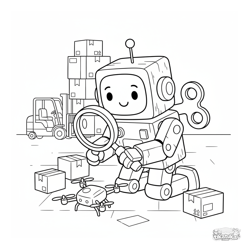 Ausmalbild für Kinder 4-6: Ein Spielzeugroboter mit einem Aufziehschlüssel in einem Lagerhaus zwischen Kisten untersucht sorgfältig eine kleine Drohne mit einer Lupe.