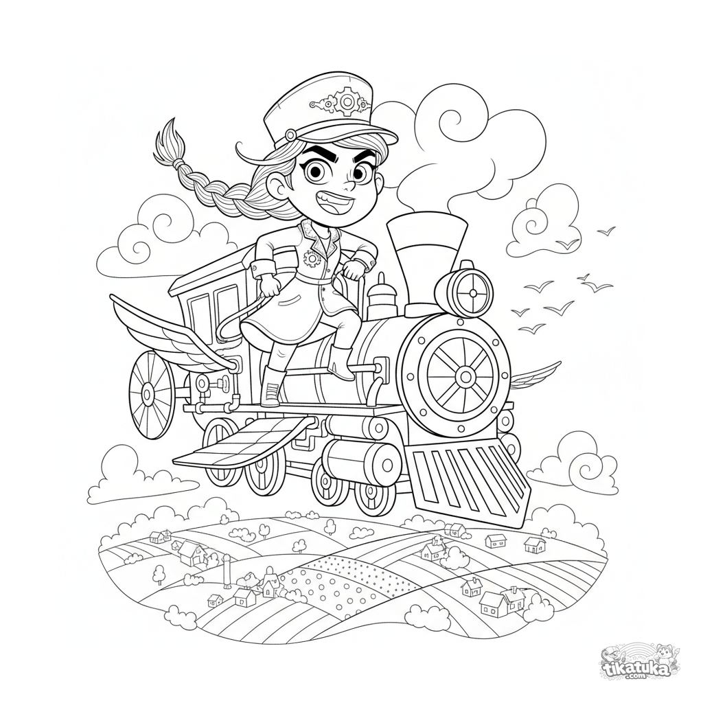 Dynamisches Anime-Ausmalbild für 10-12 Jahre: Ein mutiges Schaffner-Mädchen steht auf dem Trittbrett einer fliegenden Dampflokomotive, die über Hügel und Dörfer hinwegrast.