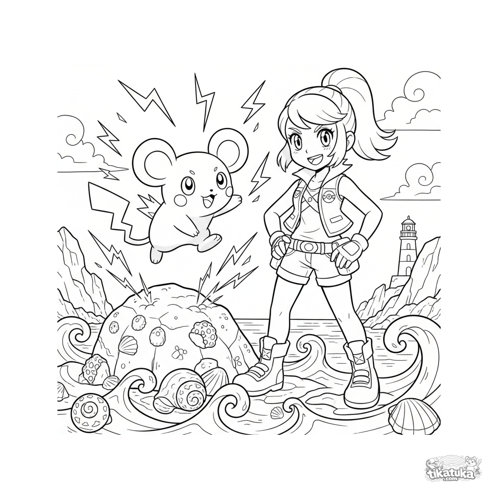 Lebendiges Anime-Ausmalbild für 10-12 Jahre. Eine Trainerin und ihr Elektro-Pokémon üben Attacken an einem felsigen Strand und erzeugen knisternde Funken.