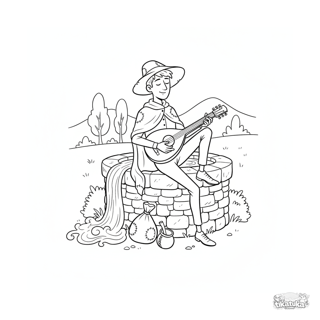 Ausmalbild für Kinder 7-9: Ein müder wandernder Spielmann stimmt sein Instrument am Brunnen. Details: Umhang, Hut, Reisesack, Trinkkürbis.