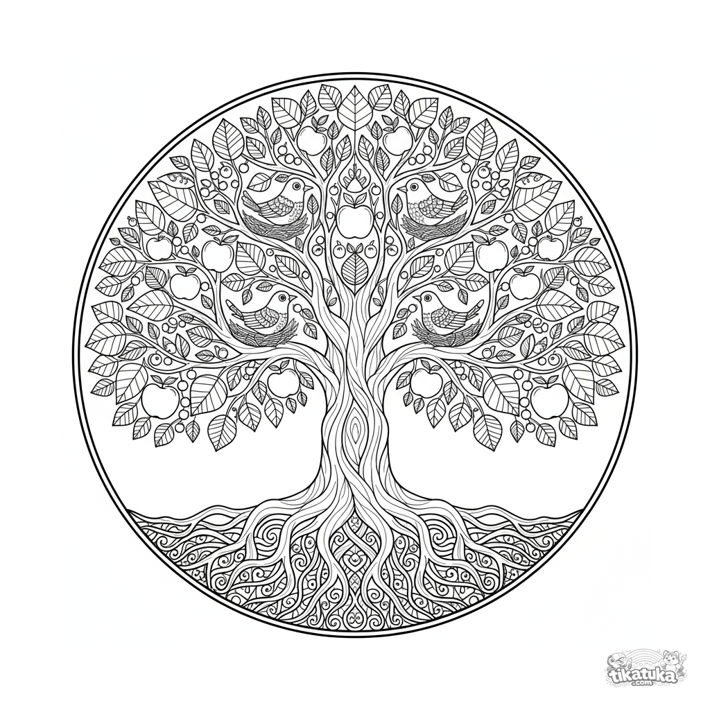 Detailliertes Baum-des-Lebens-Mandala Ausmalbild für 10-12 Jahre. Zentraler Stamm, sich ausbreitende Wurzeln, Äste mit Blättern, Früchten und Vögeln in runder Komposition.