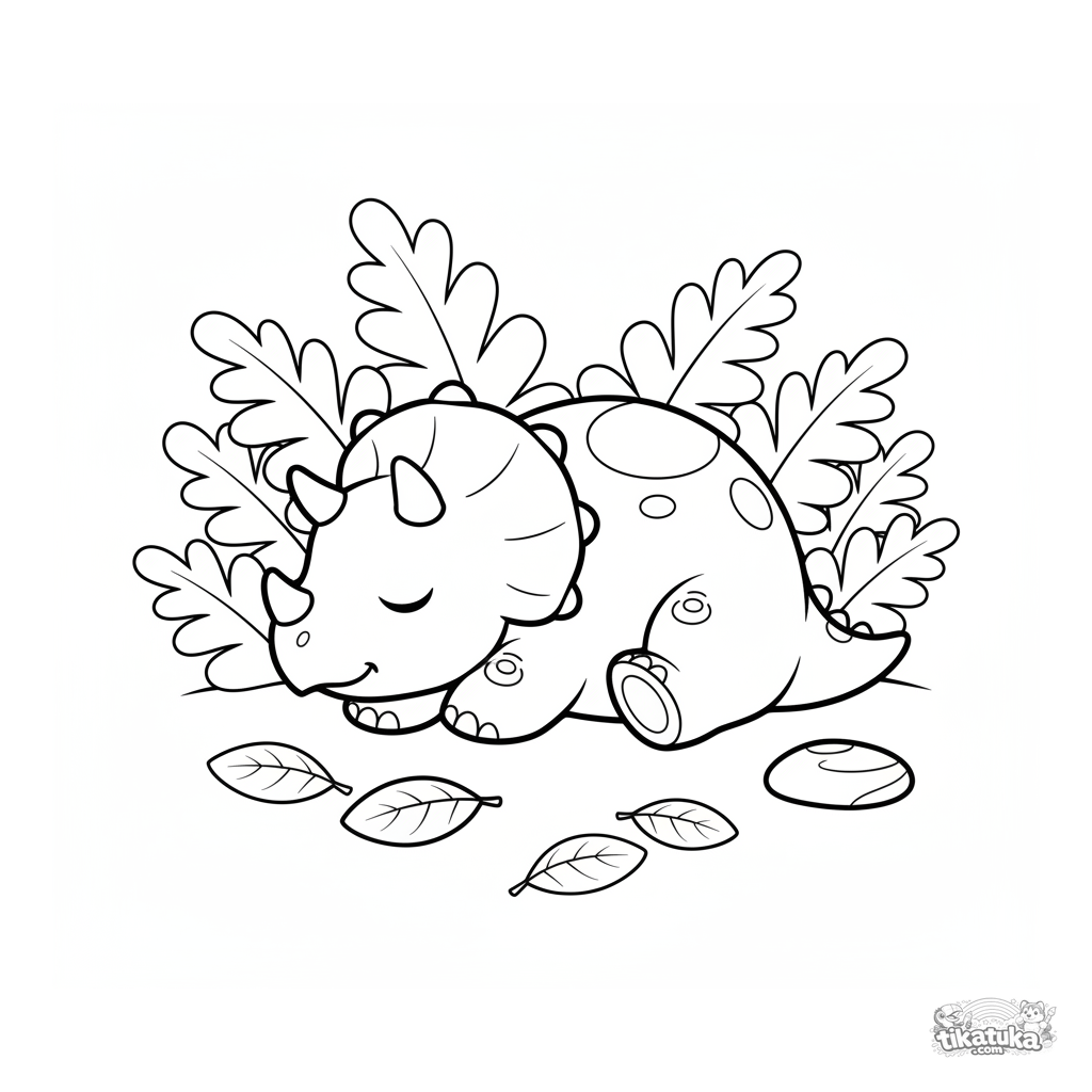 Ausmalbild für Kleinkinder: Ein Triceratops-Baby schläft friedlich in einem Farnhain. Einfache Formen und breite Ränder für erste Buntstifte.