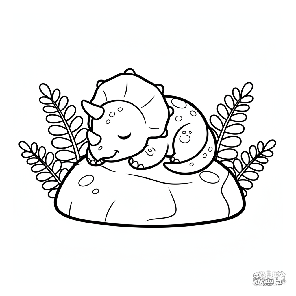 Ausmalbild für Kleinkinder: Ein süßes Triceratops-Baby schläft fest auf einem großen Felsen. Einfache, große Formen, perfekt für 2-3 Jahre.