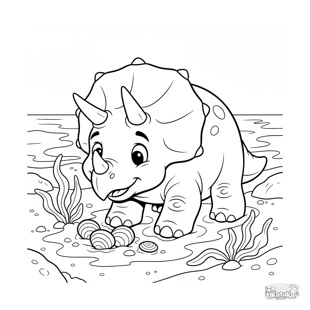 Ausmalbild für 7-9 Jahre: Ein dreihörniger Triceratops mit großem Nackenschild gräbt geduldig im nassen Sand eines uralten Ozeanufers und entdeckt Muschelschalen. Ausdrucksstarke Pose, mäßiges Detail.
