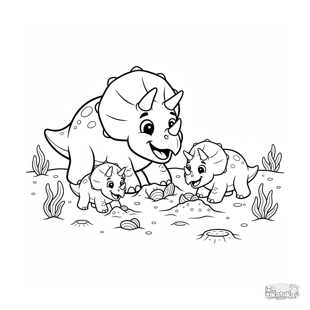 Ausmalbild für Kinder 7-9: Eine Triceratops-Familie gräbt bei Ebbe an einem uralten Ozeanstrand nach Muscheln. Dynamische Familienszene im klassischen Cartoon-Stil, Ganzkörper.