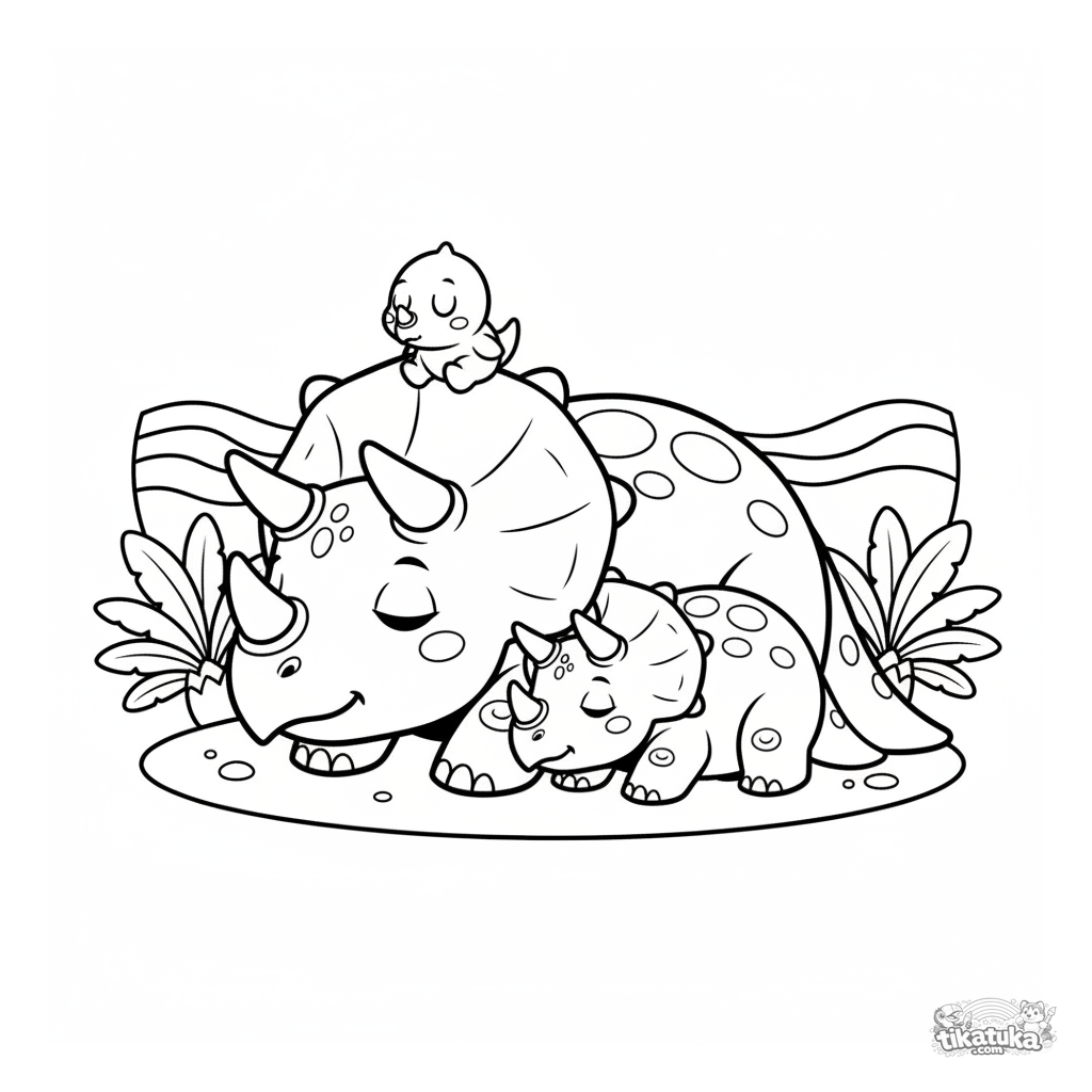 Ausmalbild für Kinder von 7-9 Jahren: Eine Triceratops-Familie ruht sich friedlich am Sandstrand des urzeitlichen Ozeans aus.